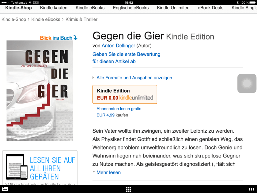 Heureka! Es ist (fast) geschafft. Teil 1 des Projekts „Schriftsteller werden“ ist erledigt. Mein eBook ist seit heute bei Amazon gelistet (siehe Bild).