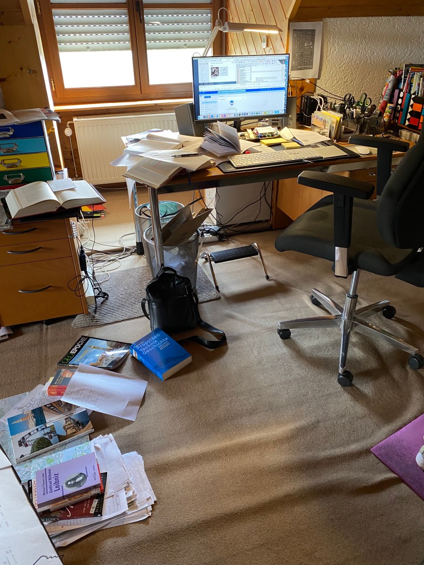 ich habe eben die S. 81 des Manuskripts „Die Sternwarte des Dogen“ entworfen/geschrieben. Dabei fiel mir auf, als ich durch diverse Bücher und Dokumente wühlte, um eine Szene zu schreiben, dass es ein wenig so aussieht, wie während meiner Masterarbeit. Gezählt habe ich 19 Bücher (z.T. neu angeschafft), zwei Zeitschriften und etwa 60 Internetdokumente, zu denen ab und zu neue kommen.