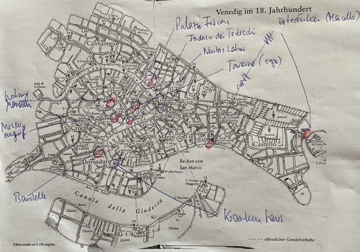 Im Bild zu dem Blogbeitrag seht Ihr meine Karte, mit der ich mich in der Geschichte orientiert habe. Sie zeigt wesentliche Orte der Handlung. Der Roman spielt 1689, die Karte ist aus dem 18. Jh; ich denke, die Ungenauigkeiten halten sich in Grenzen. Ich benutze zur Orientierung parallel auch noch eine moderne Karte und stelle fest, es gibt einige Änderungen. Die historische Karte habe ich aus einem Buch, das wichtige Orte (Gebäude, Kirchen, Plätze) gekennzeichnet hat, das macht die Einordnung leicht. Da man sich ja im Jahre 1689 nicht mit Motorbooten bewegt hat, musste ich die Entfernungen immer bei „schnellen“ Ortswechseln, Benachrichtigungen etc. berücksichtigen. Mittlerweile kenne ich mich ganz gut aus in der Stadt. Meine Frau und ich haben beschlossen, im nächsten Frühjahr noch einmal nach Venedig zu reisen. Für unmittelbare Recherche wird es möglicherweise nicht zu spät sein, weil ich mit einem weiteren Jahr zur Überarbeitung rechne. Der erste Entwurf braucht nicht mehr lange, dann beginnt die eigentliche Arbeit. Man glaubt nicht, wieviele Ungenauigkeiten, Löcher und Fehler man noch findet, obwohl man sich doch solche Mühe gegeben hat. Am meisten ärgern mich Plotfehler (Dinge, die gar nicht so passieren können), freuen tun mich immer sich plötzlich ergebende Möglichkeiten, den Leser im Plot plausibel weiter zu verwirren oder sinnvolle, belebende Ergänzungen, die sich auftun.