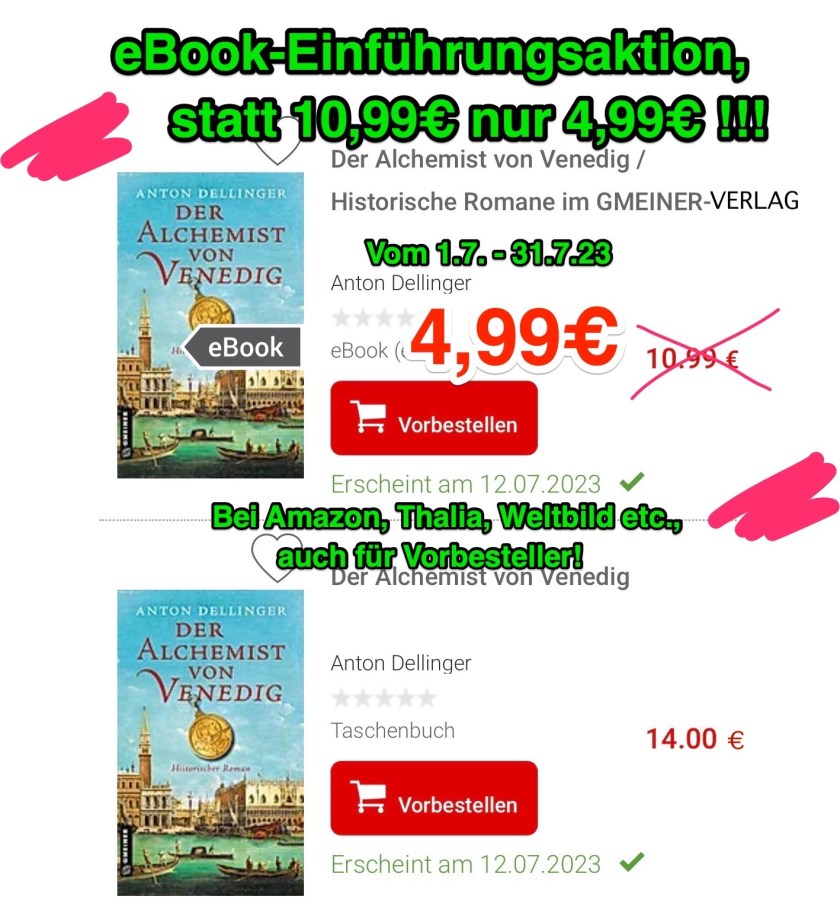 der Gmeiner-Verlag informiert mich, dass im Juli (1.-31.) zur Einführung von „Der Alchemist von Venedig“ der Preis des eBooks von 10,99€ auf 4,99€ reduziert wird. Egal, wo ihr das eBook kauft oder vorbestellt.